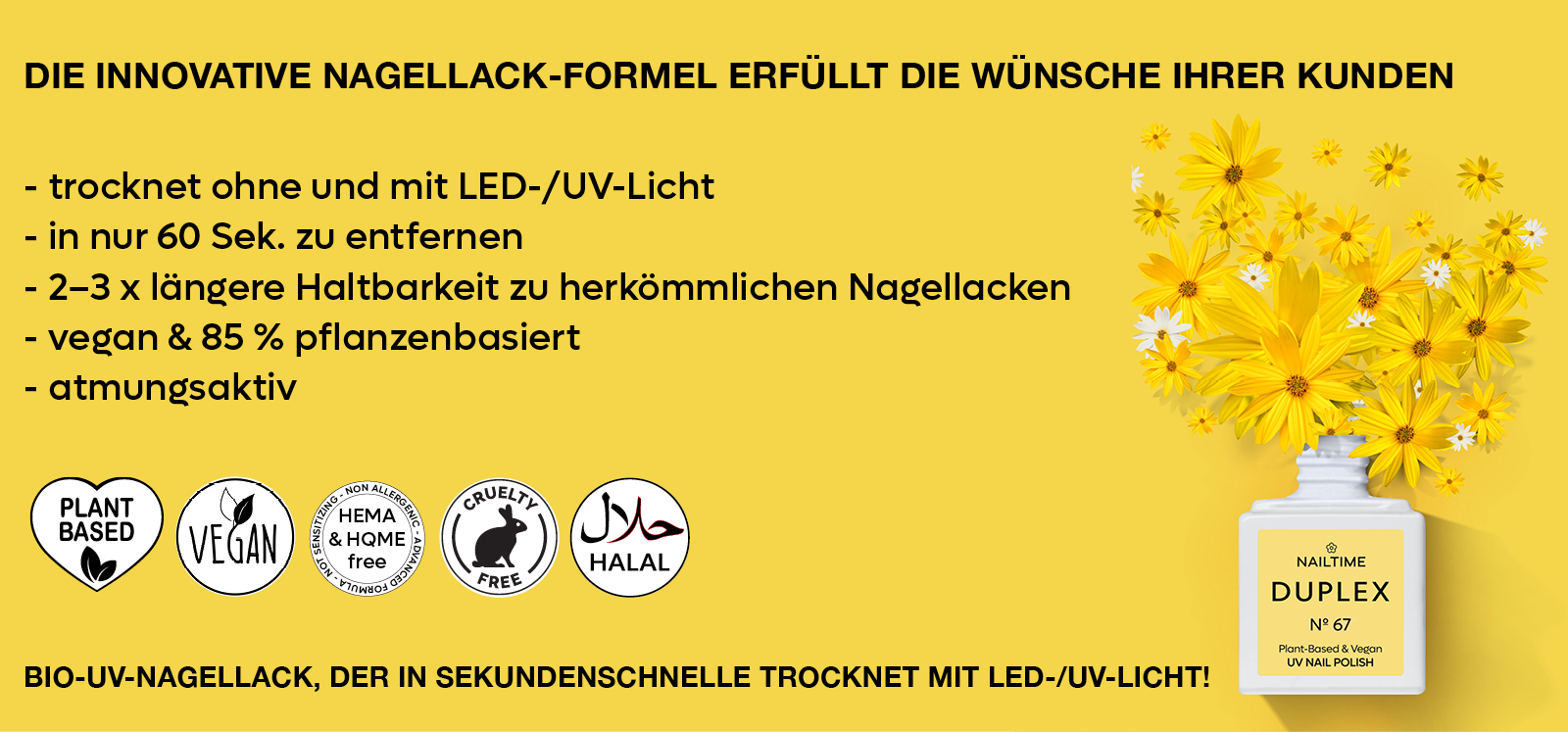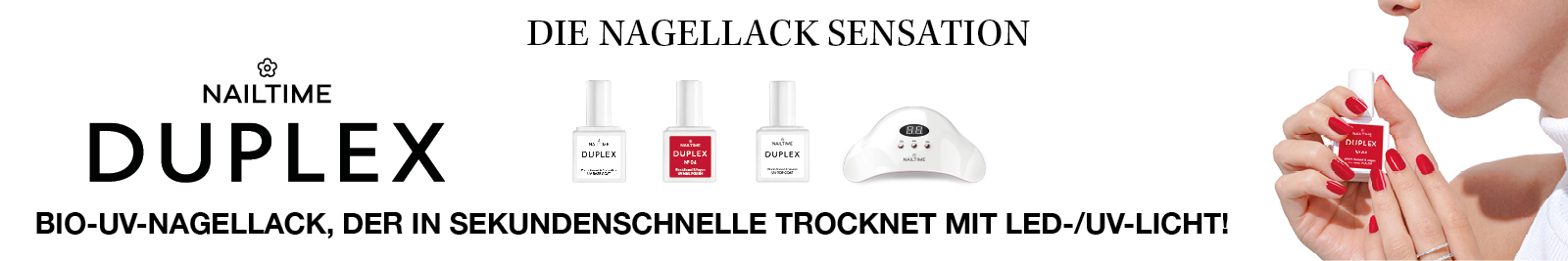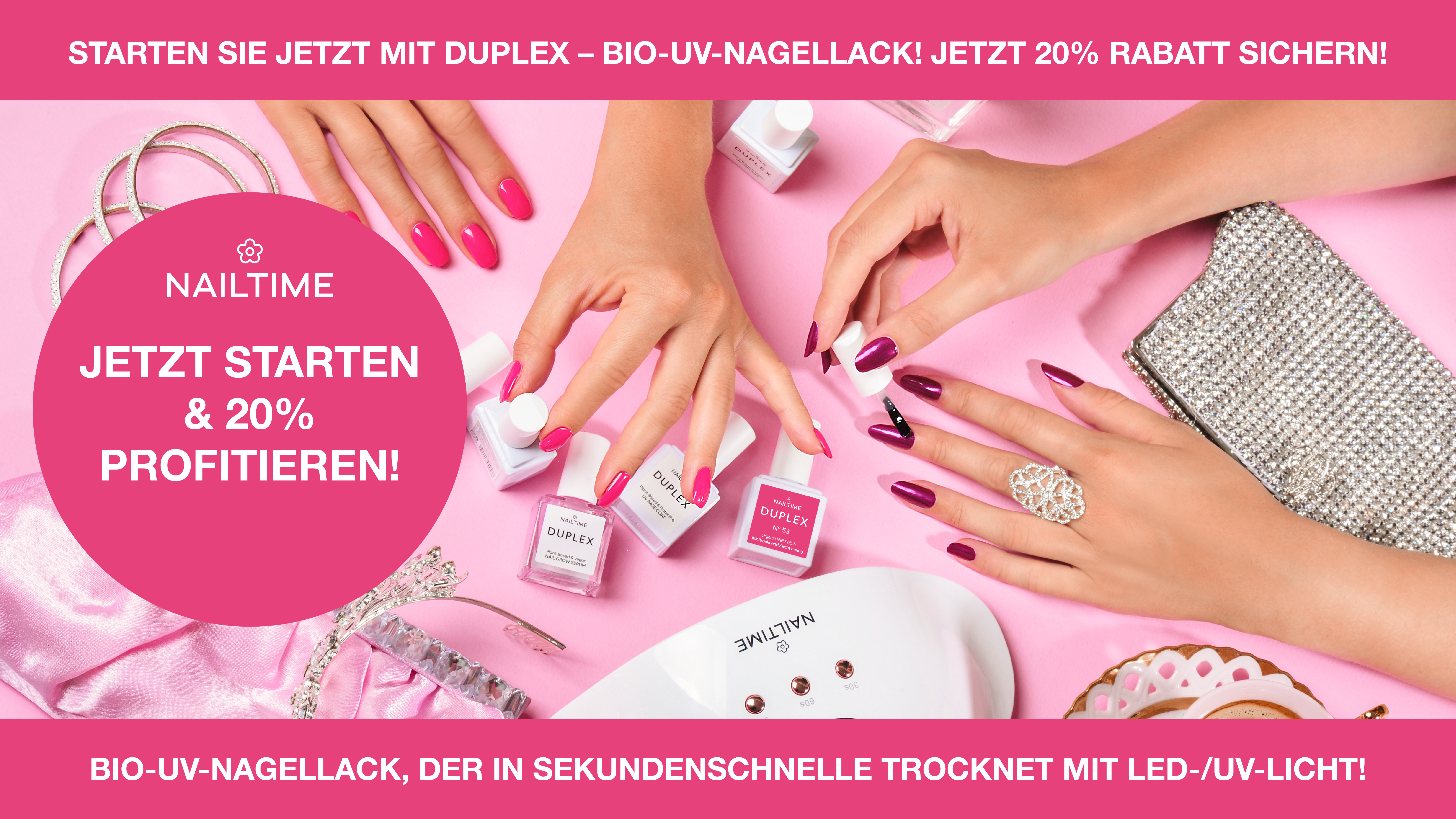 Profitieren Sie jetzt von 20% Rabatt und starten Sie durch mit der neuen innovativen Nagellacktechnologie von NAILTIME DUPLEX, der BIO-UV-Nagellack, der in Sekundenschnelle trocknet mit LED-/UV-Licht.